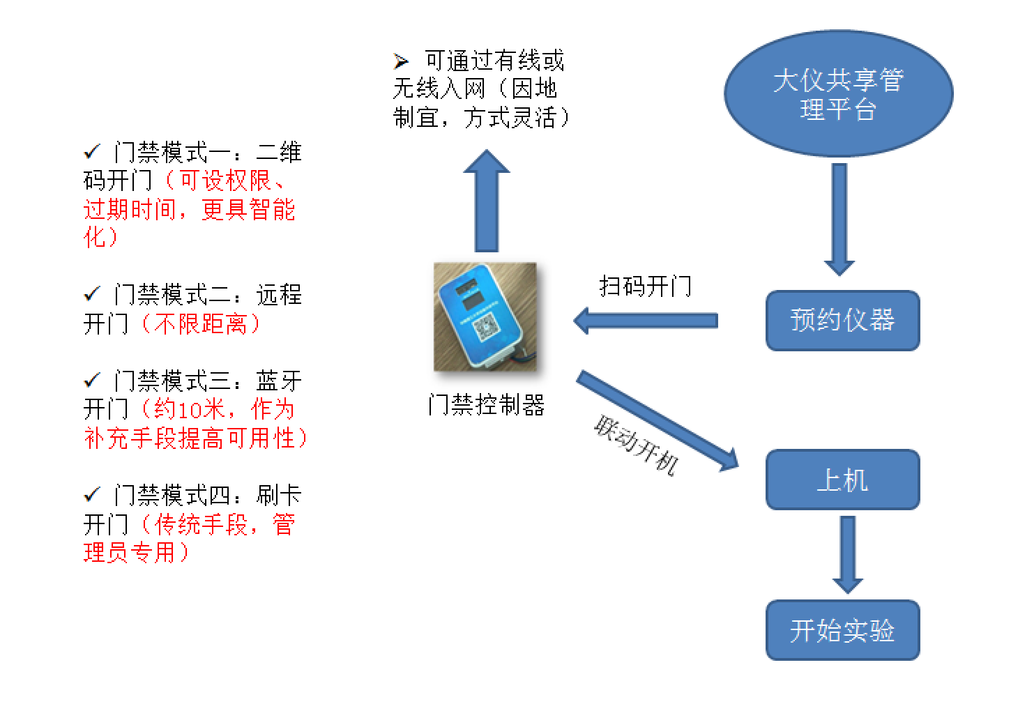支持二维码、远控、蓝牙等多种门禁管理模式,并与大型仪器共享管理平台或其他物联网设备实现智能联动,实现开门上机或联动控制其他设备等操作。