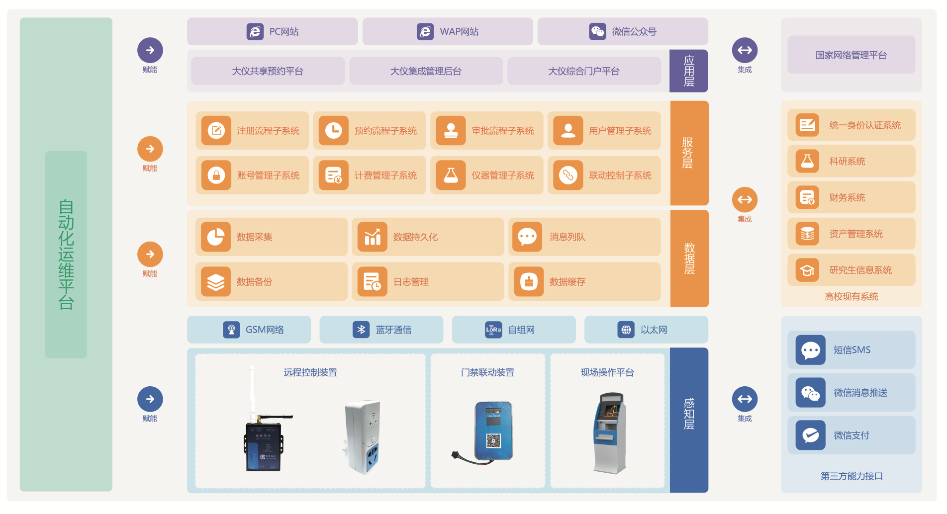 “仪器共享管理平台”主要面向学生、老师、校外人员提供预约申请、上机、下机、查看交易流水等功能。分为两个子系统:(1)大型仪器设备在线预约平台,支持WAP、WEB、微信公众号、钉钉等多终端在线预约大型仪器设备,使大型仪器设备实验教学变得简单方便。(2)大型仪器设备综合管理平台,在线管理大型仪器设备,实时监测仪器设备使用状态,及获取分析相关数据。