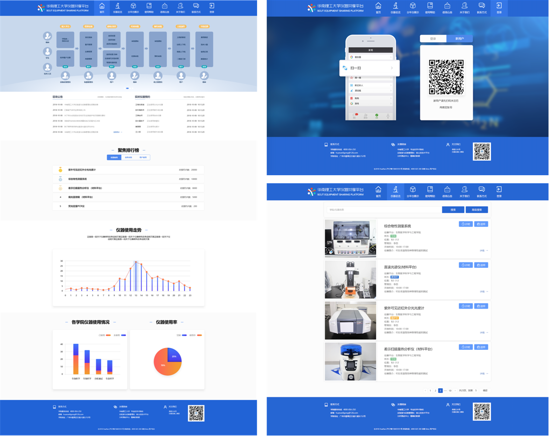 “仪器资产综合门户”主要面向所有用户提供消息发布、仪器展示、运营统计等功能。仪器设备预约使用及系统运作情况总体分析,院级分平台风采展示及相关状态更新。